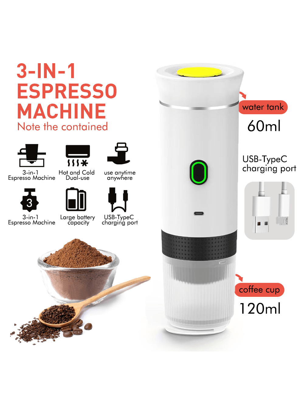 طقم صانع قهوة لارسال ثابتة لا سلكية سريعة التسخين، محمولة وإعادة شحن لصنع إسبرسو، شحن USB ، سهل الاس